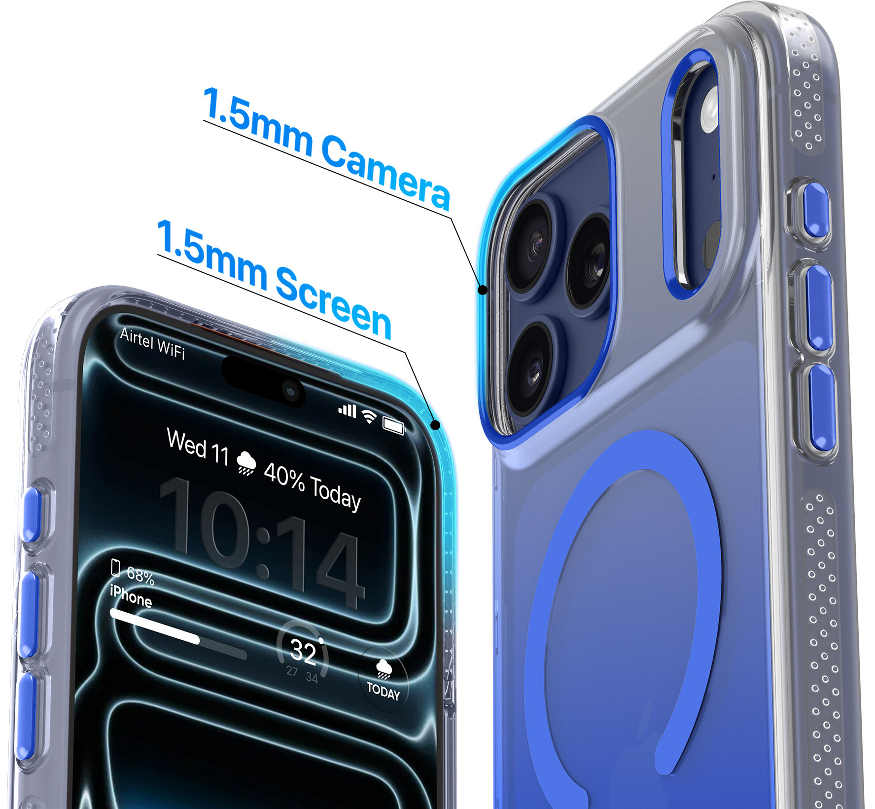 The design for the iPhone with mag-safe is military-grade drop protection. The 1.5mm raised screen lips and lifted 1.5 mm camera bezels prevent scratches, and smudges.
