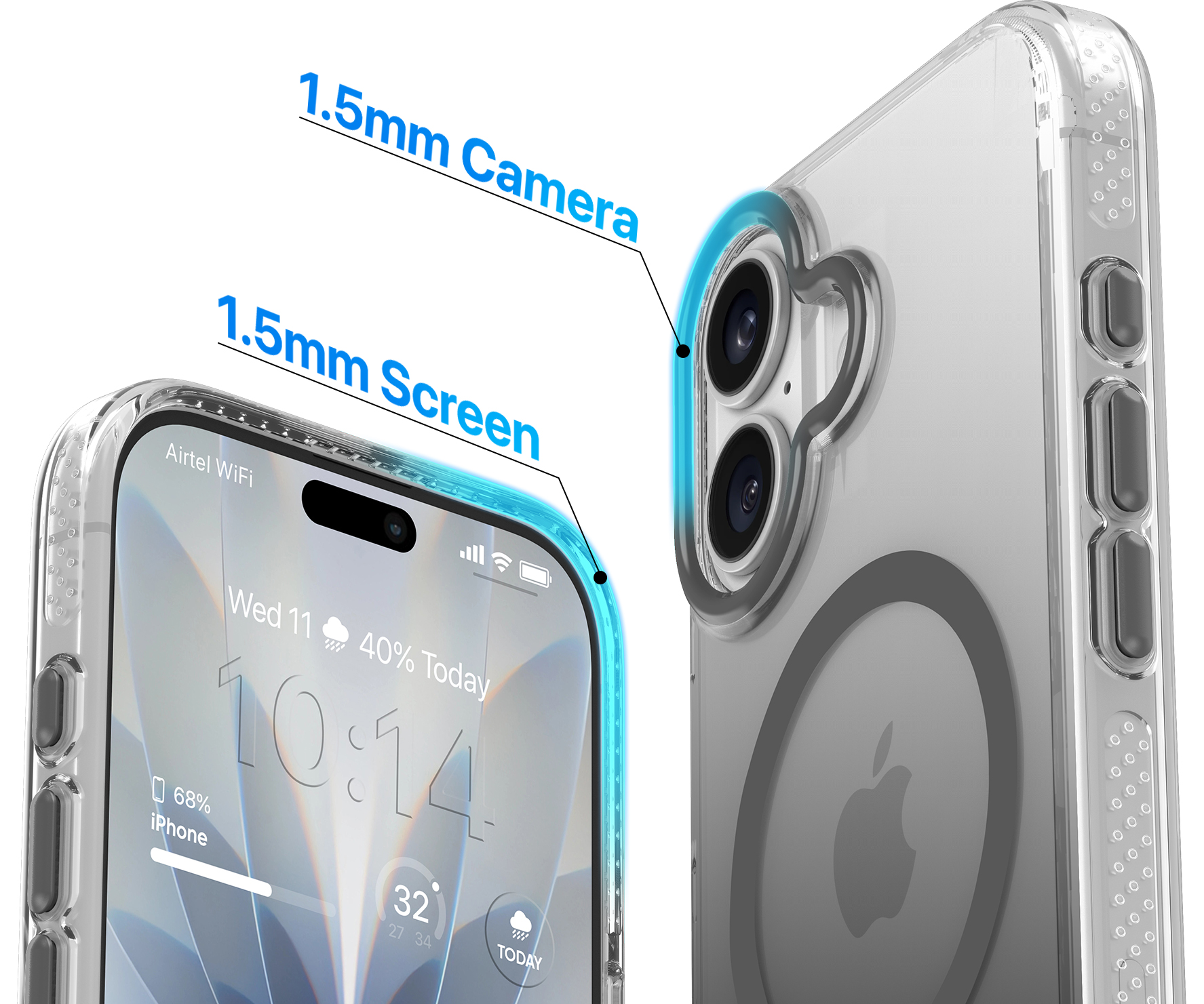 The design for the iPhone with mag-safe is military-grade drop protection. The 1.5mm raised screen lips and lifted 1.5 mm camera bezels prevent scratches, and smudges.